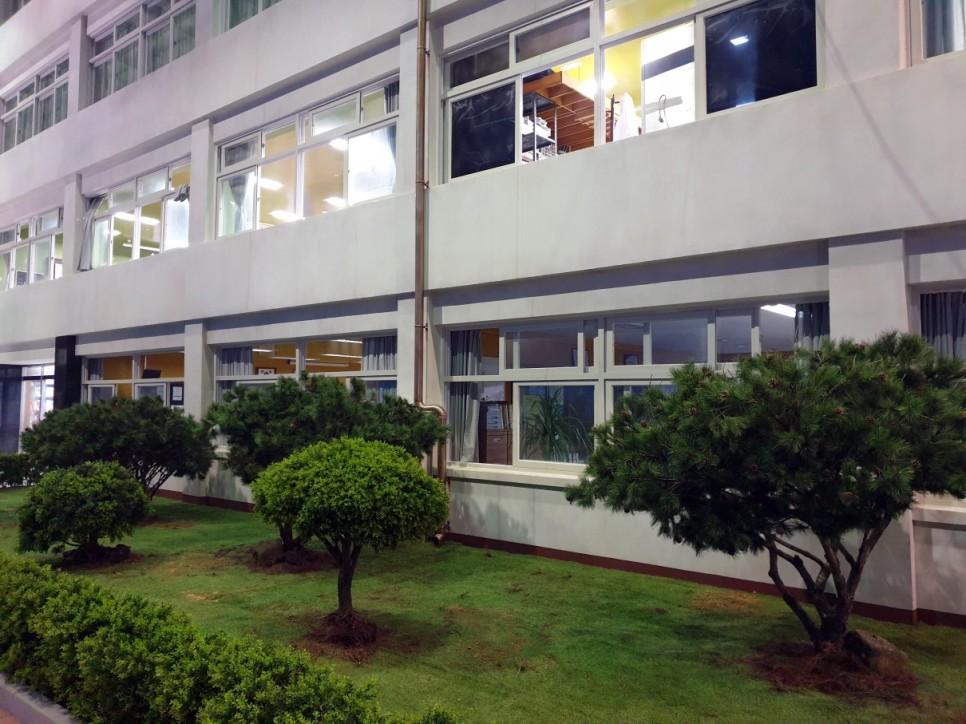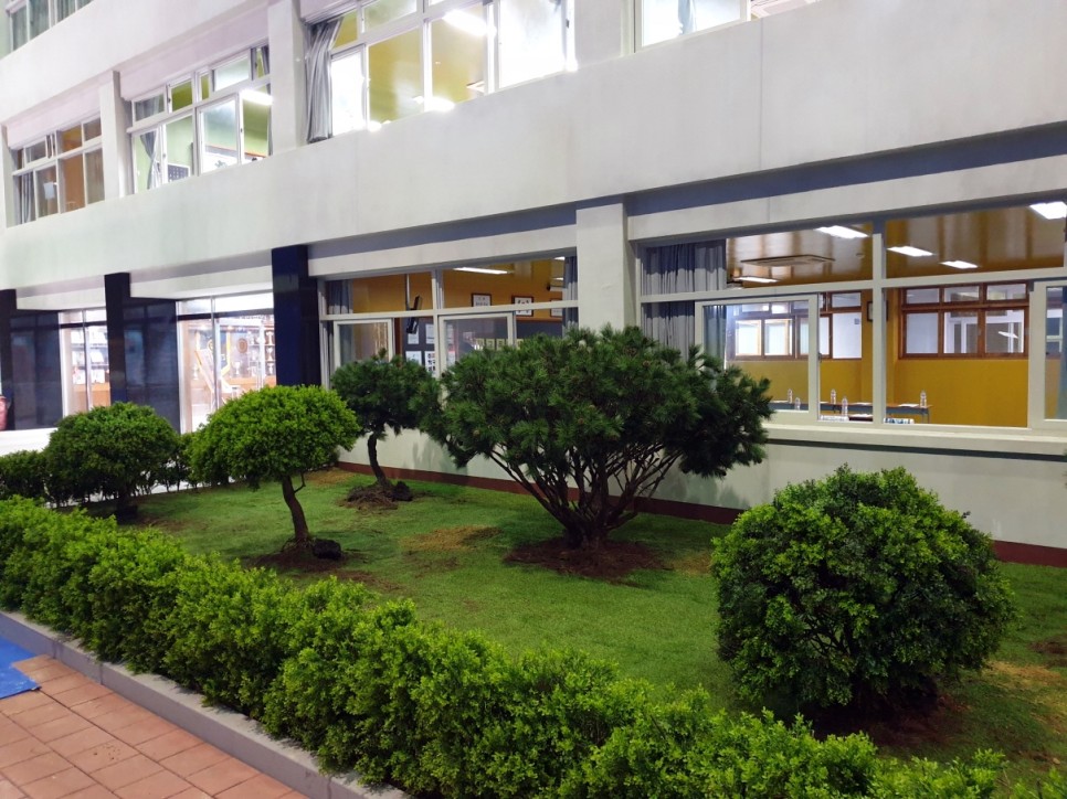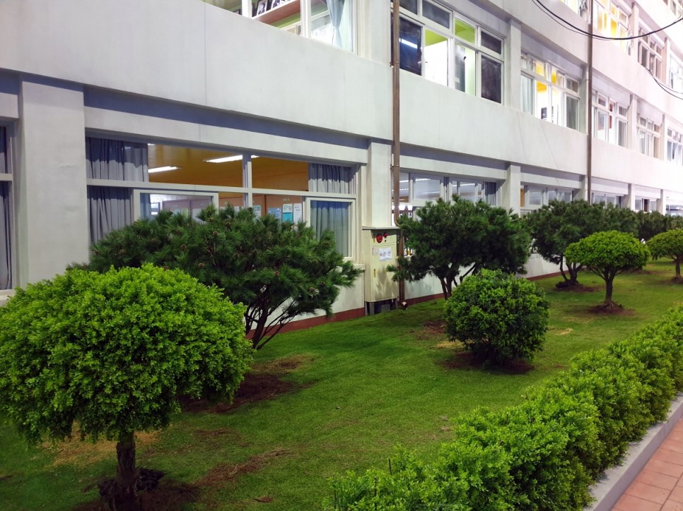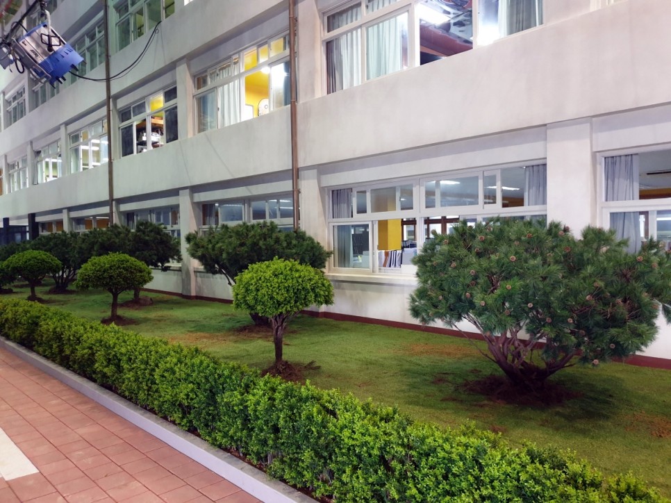 학교 건물 앞에 조경을 했어요
