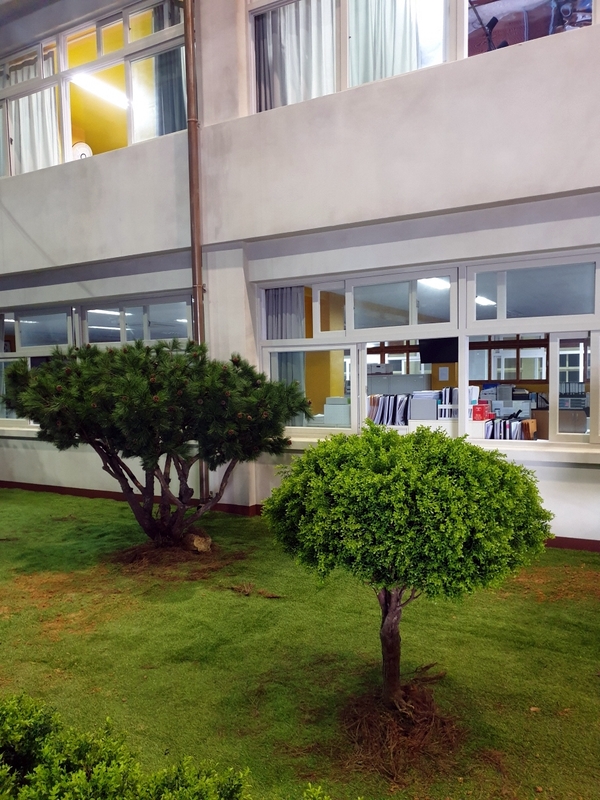 바닥에 인조잔디를 깔고, 반송과 둥근 회양목을 세팅했어요