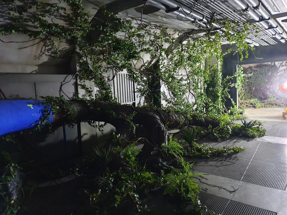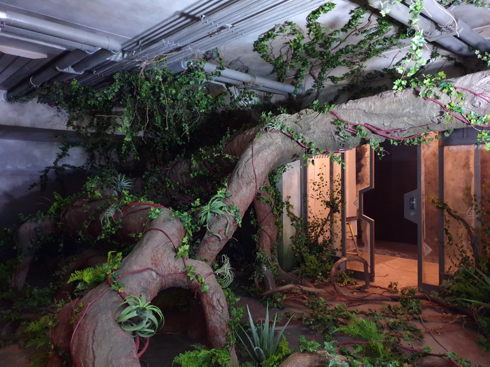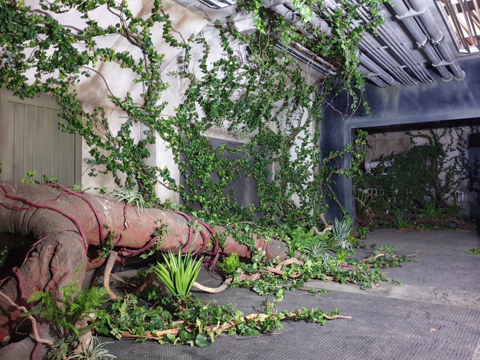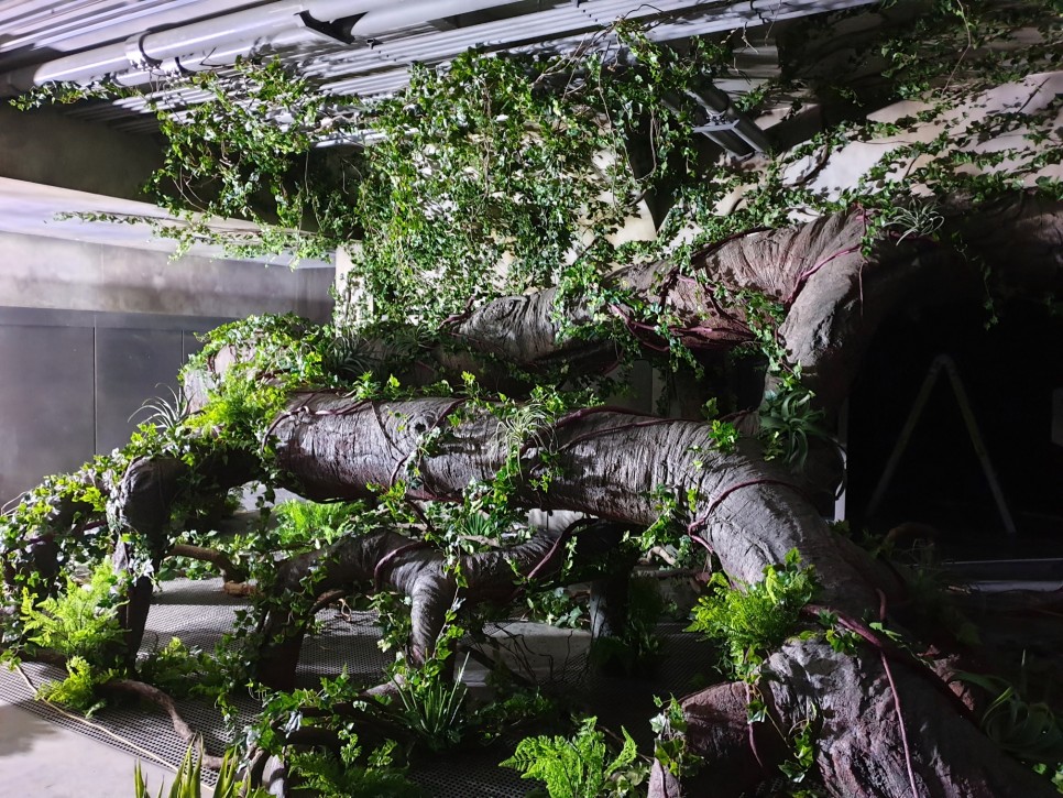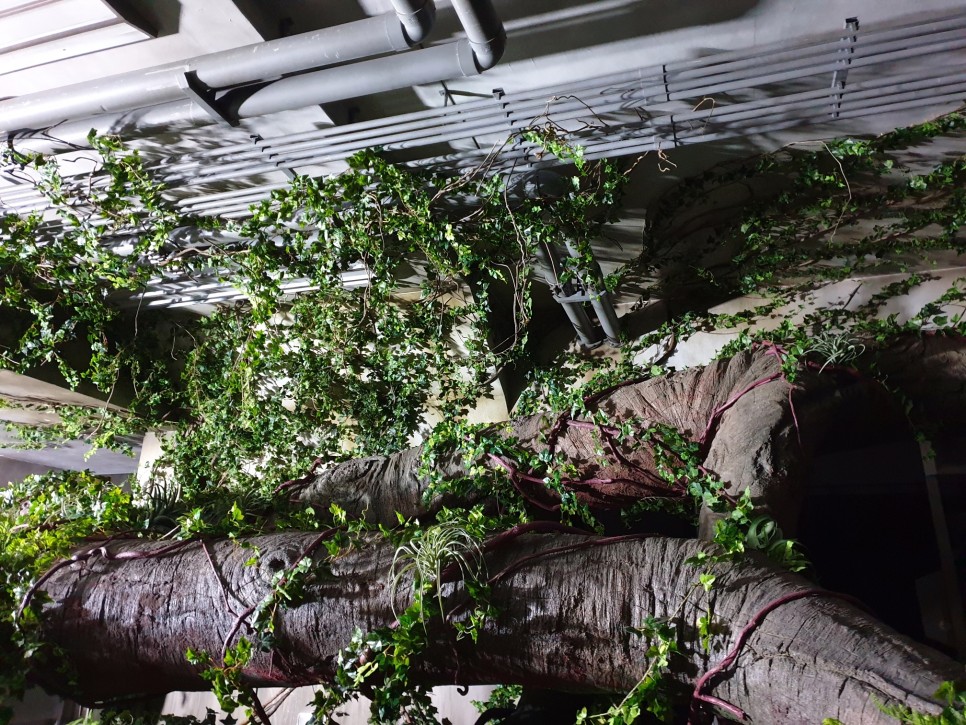 건물 안을 휘감고 있는 거대한 나무 기둥에 덩굴을 감고, 고사리 같은 식물로 연출했어요~