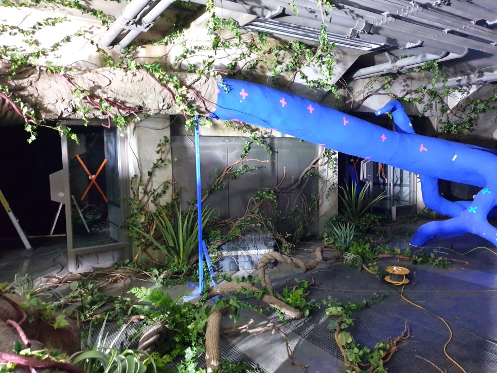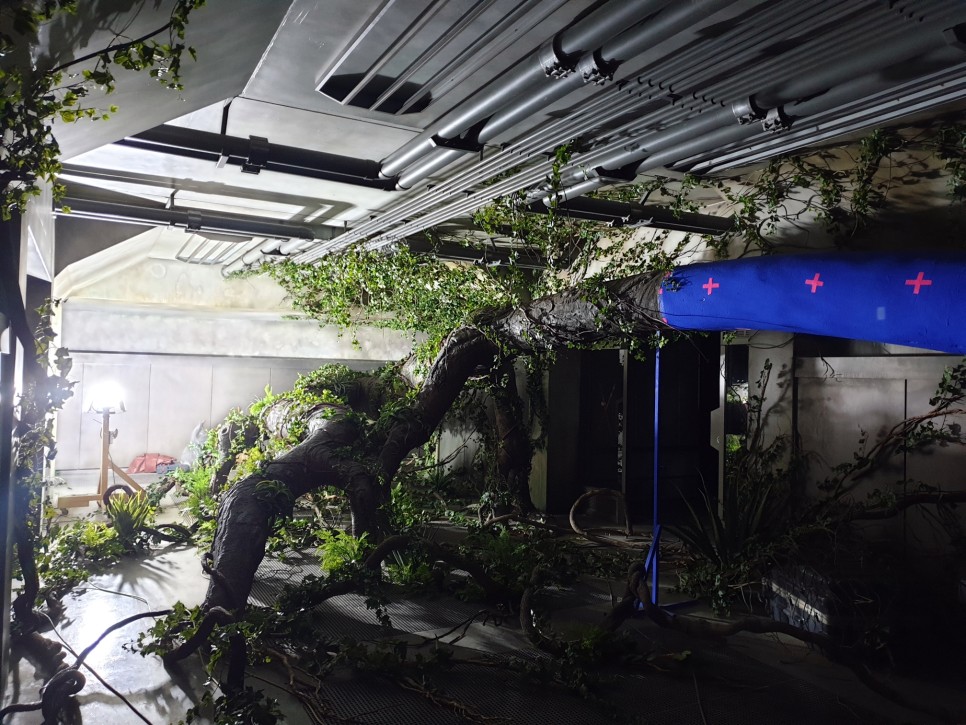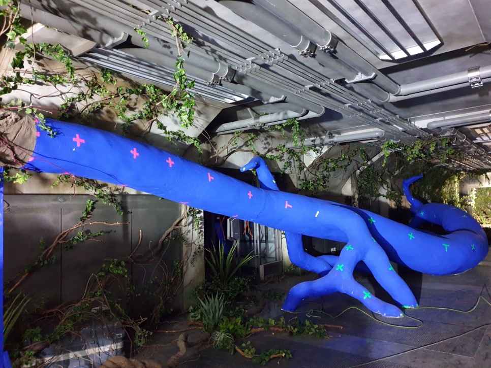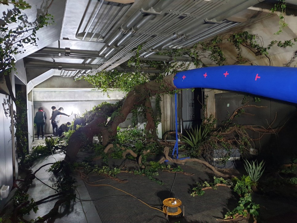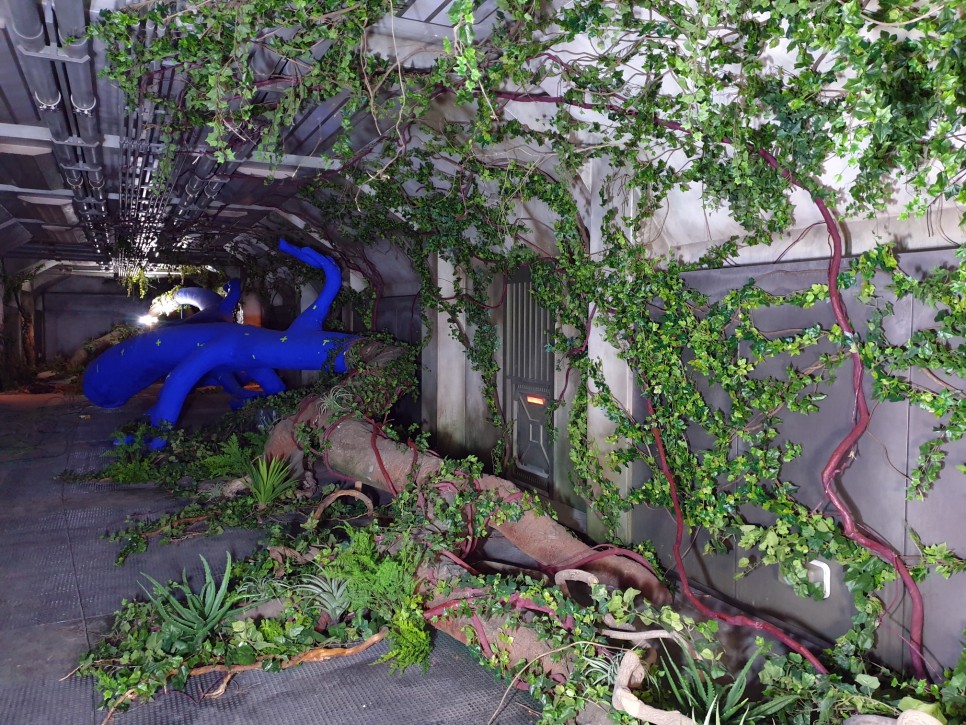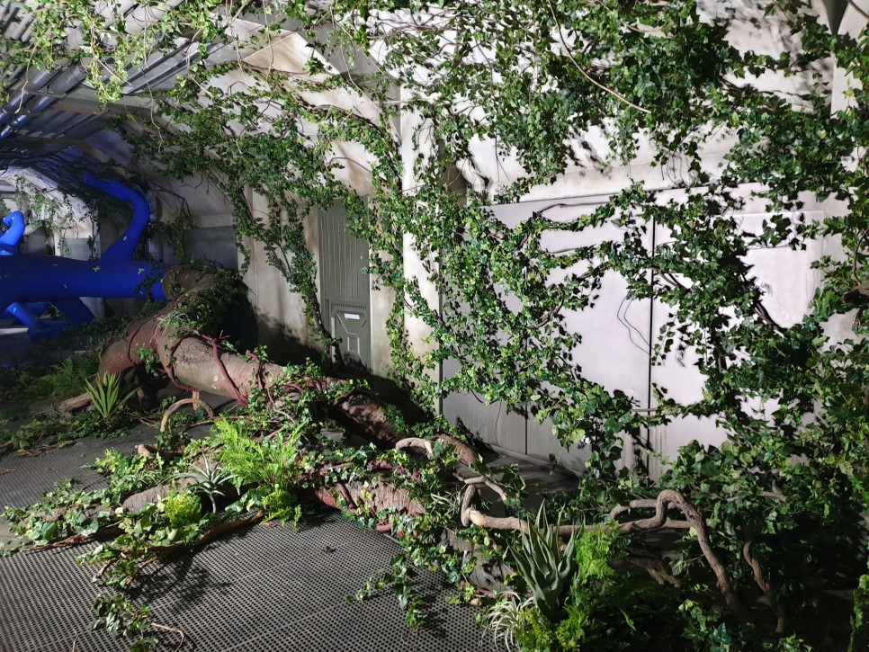 건물 안을 휘감고 있는 거대한 나무 기둥에 덩굴을 감고, 고사리 같은 식물로 연출했어요~