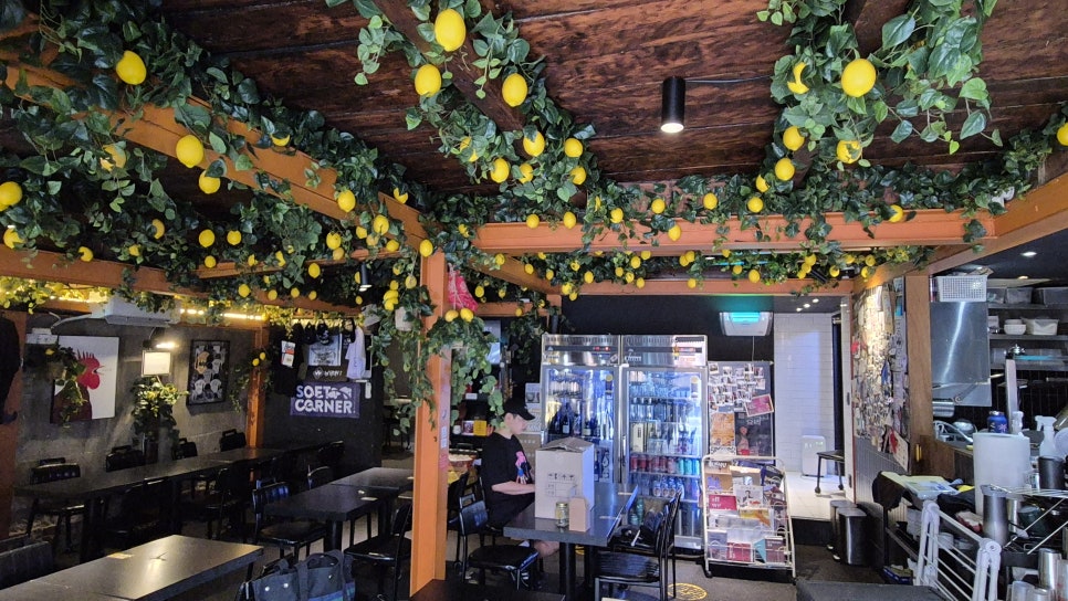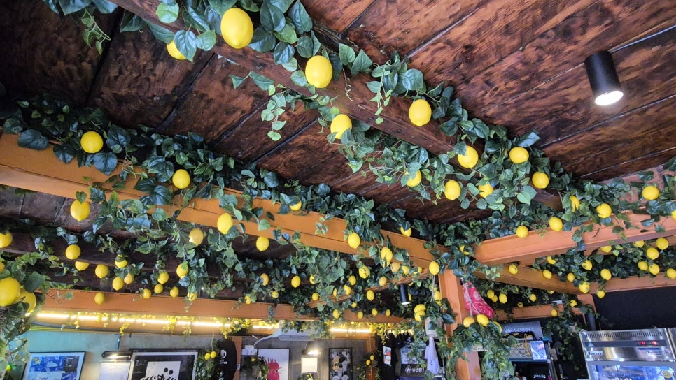 매장 내부에도 천정에 레몬으로 장식하고, 행잉화분을 걸었어요~
